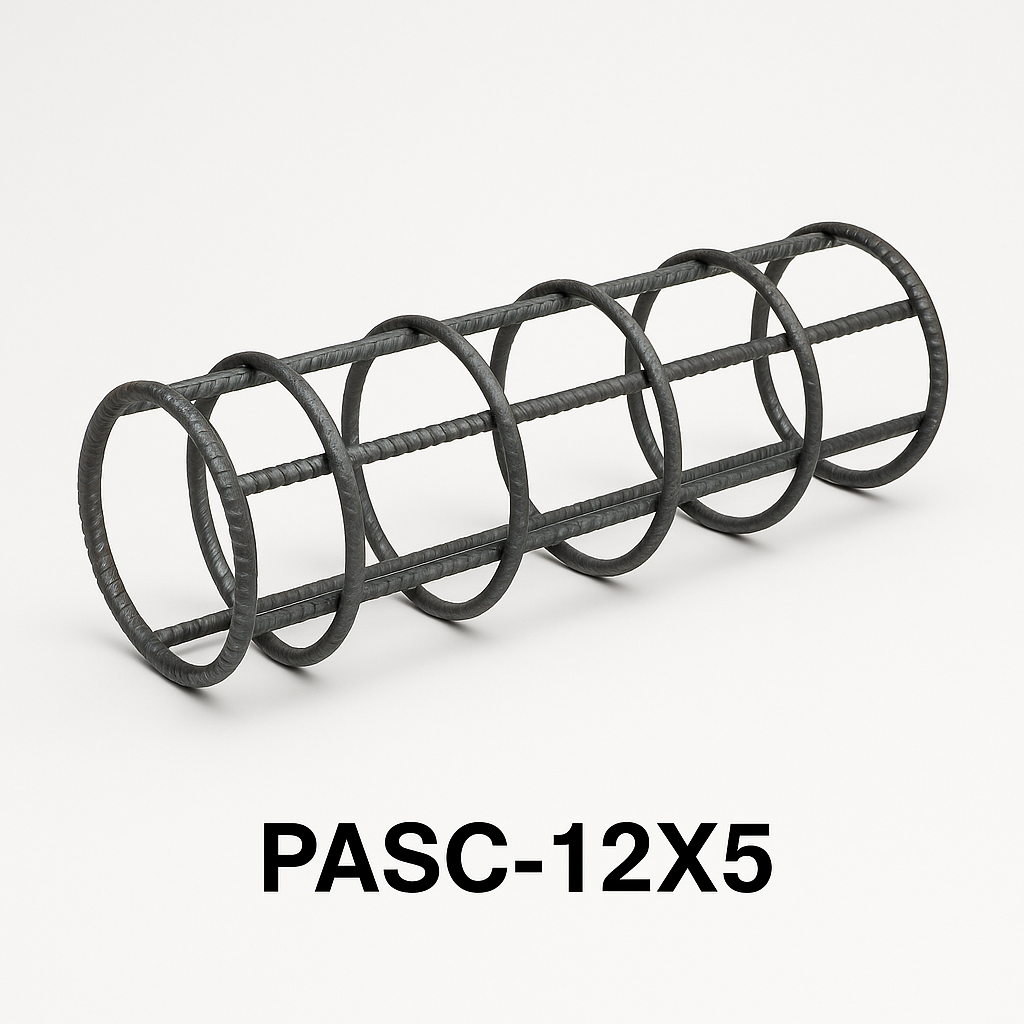 The PASC-12X5 is a high-quality 12" diameter pre-tied rebar cage designed for short foundation elements such as drilled shafts, columns, piers, and caissons where moderate embed lengths or shallow depths are required. Built for efficiency and reliability, this cage arrives jobsite-ready to save valuable time in the field.