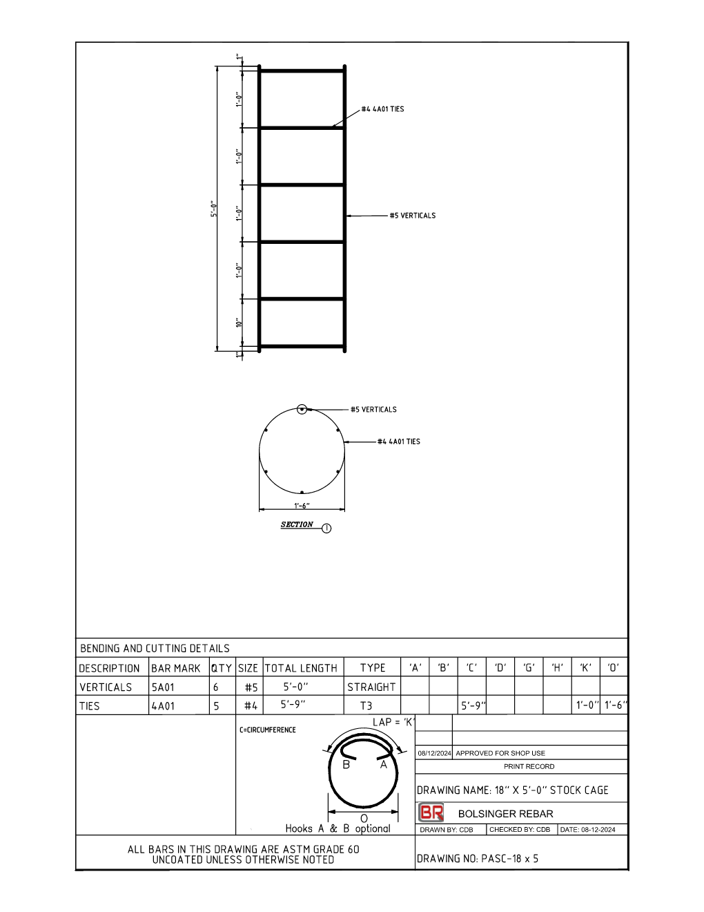 The PASC-18X5 is a robust, jobsite-ready 18" diameter pre-tied rebar cage, engineered for short foundation structures such as drilled shafts, caissons, piers, and columns that require a larger diameter and reliable reinforcement. Designed for efficient field use, this cage saves time and labor while delivering high structural integrity.